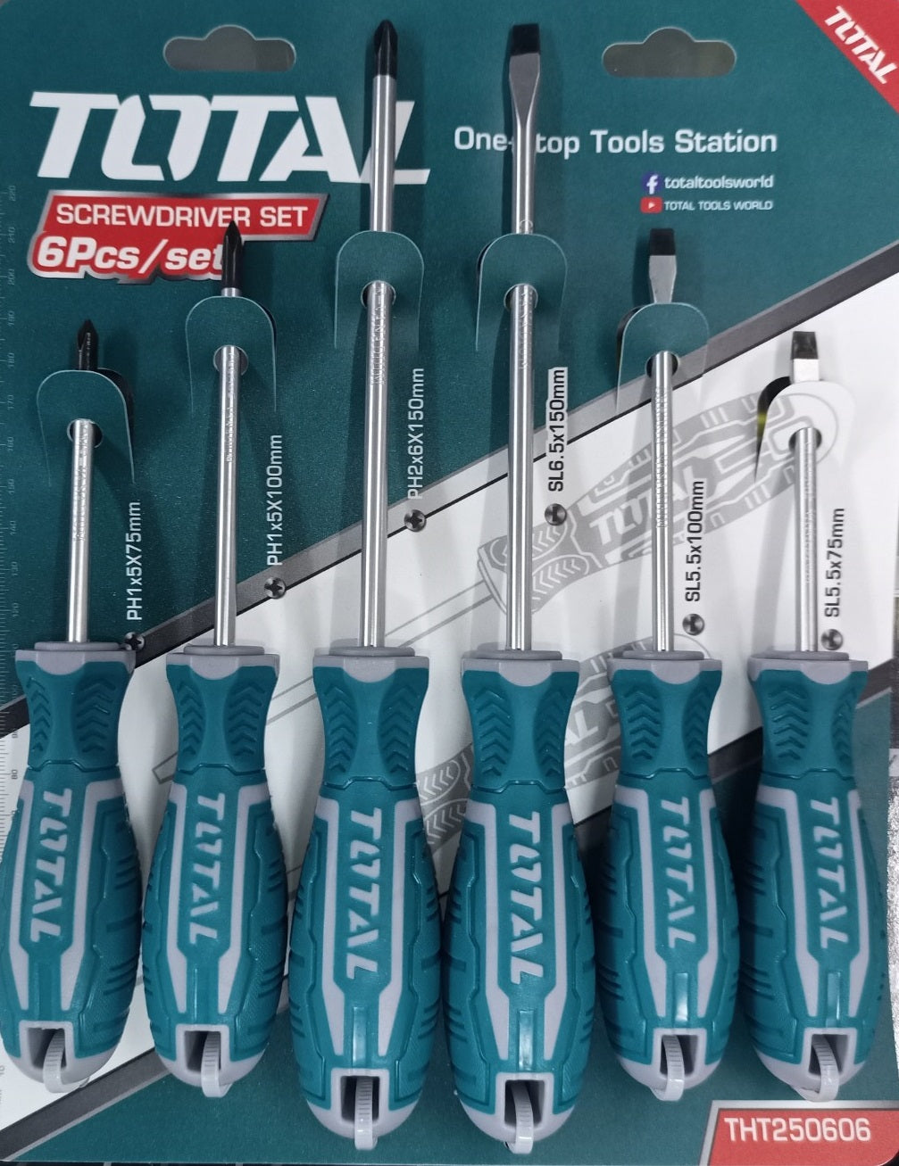 conjunto de 6 destornilladores calidad profesional con mango bimaterial que proporciona un excelente grip y resisencia. Punta imantada para mejor rendimiento.